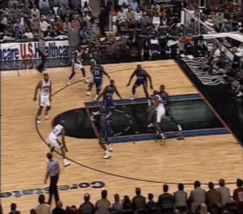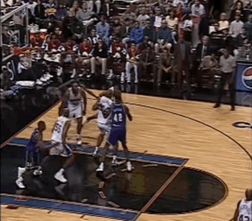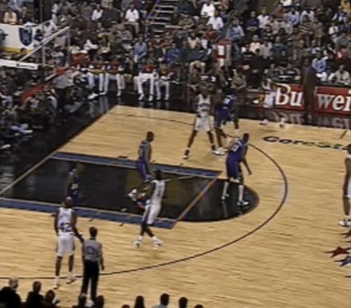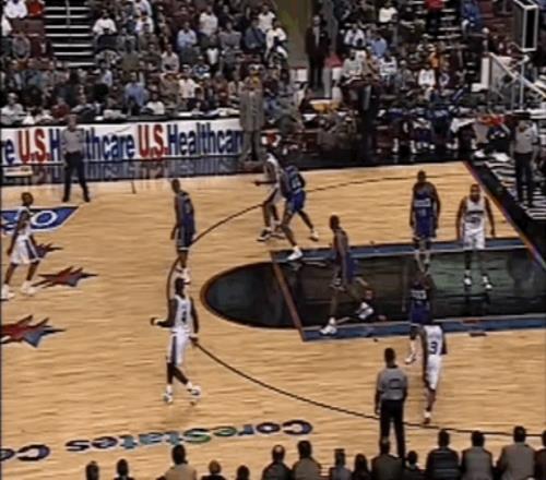 半场结束时,76人落后雄鹿7分。易边再战,艾弗森看上去逐渐适应了比赛节奏,他在阵地战中愈发活跃:先是通过手递手飙进三分,那个赛季他很快成为联盟排名前列的三分手;随后,随后又两次在底线区域觅得机会,一次补篮、一次空切,展现出敏锐的无球嗅觉。