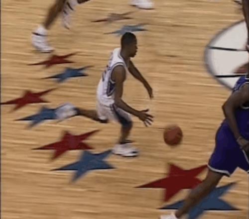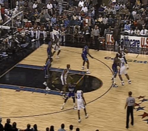 初次踏上NBA赛场的阿伦-艾弗森,形象与人们日后熟知的经典模样尚有几分不同:他尚未留起标志性的地垄沟发型,一头利落短发显得青涩而干练;他也没有佩戴标志性的头带和袖套,但是脚上“黑脚趾”配色的锐步Question球鞋依旧夺目。 比赛开场,艾弗森打得很有侵略性,很快展现出自己绝对的速度优势,但前三次出手要么被对手拦下,要么直接三不沾。 两幕插曲或许点燃了他的斗志:先是同届选秀的5号秀雷-阿伦在他头上投进了生涯首分,“君子雷”在转换中找到了艾弗森,一记突破后的背后运球把他晃了个趔趄,然后稳稳投进了大空位中投;紧接着,杰里-斯塔克豪斯很快还以颜色,他接球后以迅雷之势摆脱阿伦,上演了一次十佳球级别的反身扣篮。