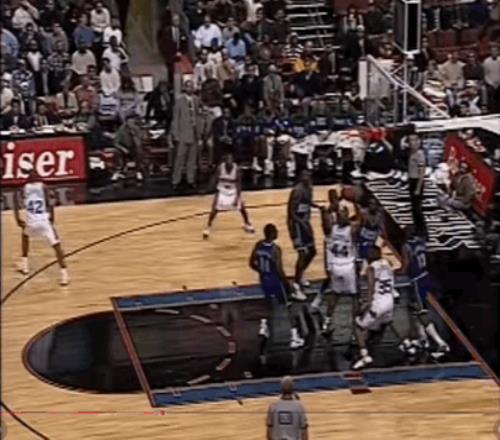 当时联盟的进攻风格与现在天差地别——那仍属于内线的末法时期,比赛节奏普遍缓慢而沉闷,进攻大多要围绕大个子球员展开。1990年选秀的状元秀德里克-科尔曼是76人半场进攻的核心,只要他在场,球队就会尽量将球交到低位由他发起。而斯塔克豪斯作为球队上个赛季的头号得分手,同样需要在侧翼和低位获得进攻机会。贵为状元,艾弗森也不得不先学会给老大哥们“打下手”,常常需要等待队友落位,再伺机传球。 然而,当比赛进入攻防转换,赛场对艾弗森而言便豁然开朗。这是他最能展现运动天赋的舞台:上半场他砍下11分4助攻,大部分的进球都来自快攻,包括一记技惊四座的一条龙劈扣。